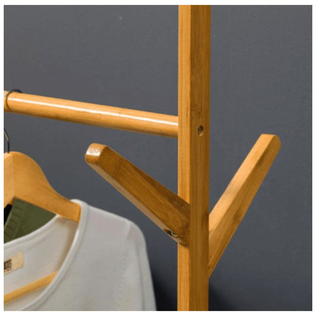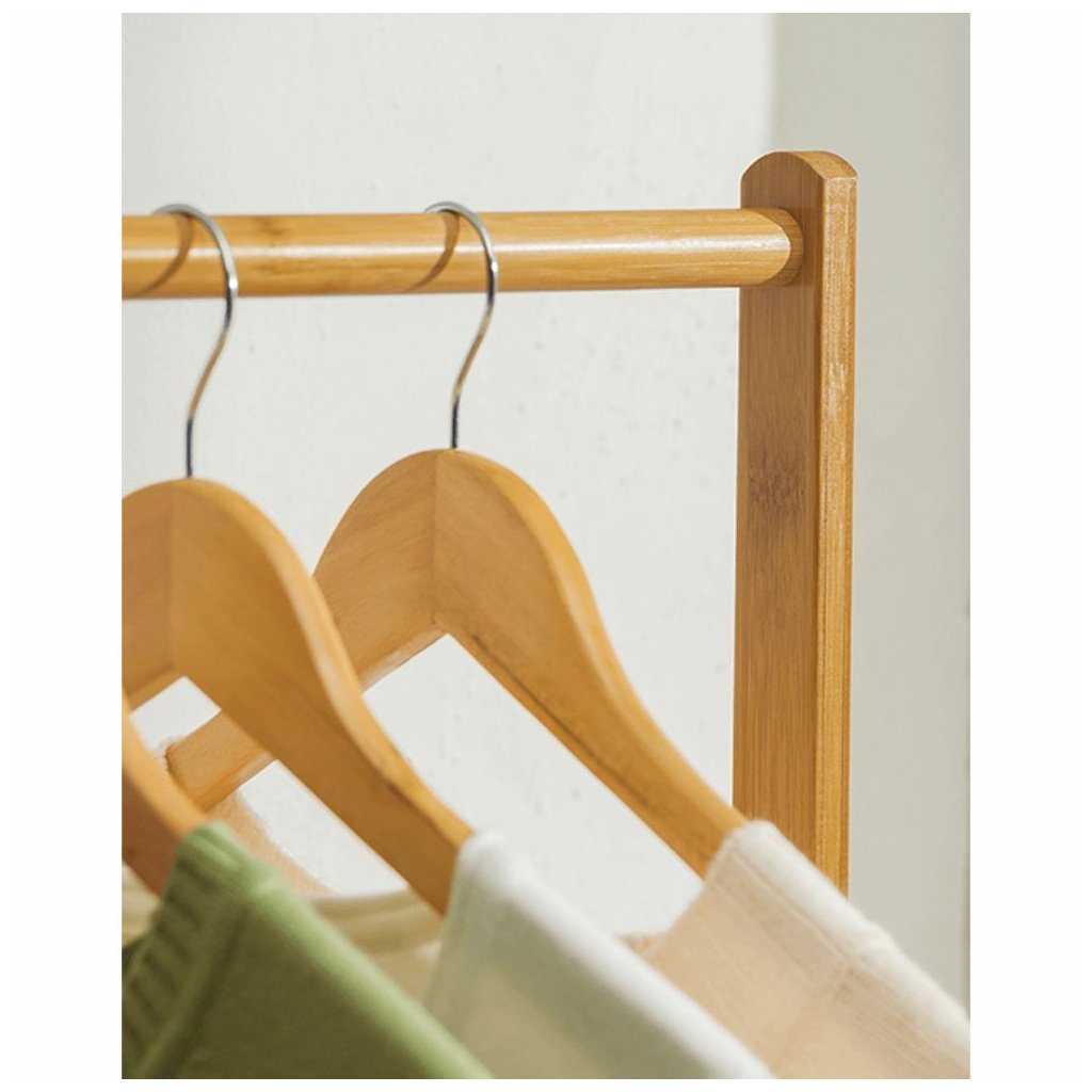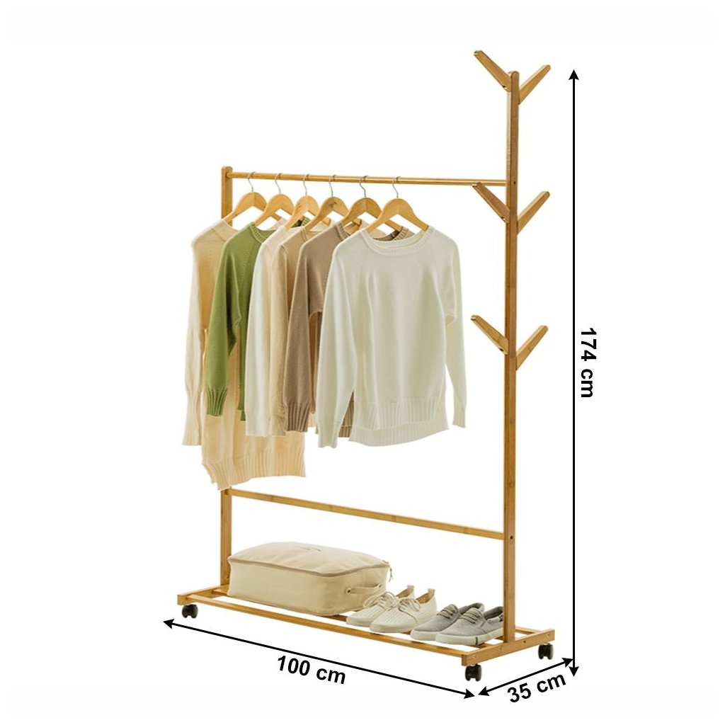 Praktický stojan na šaty z bambusu s nosnosťou 15 kg. Rozmery 100x35x174 cm, vybavený vešiakovou tyčou, spodnou policou a šiestimi háčikmi. Mobilný na štyroch kolieskach, dodávaný v demonte.