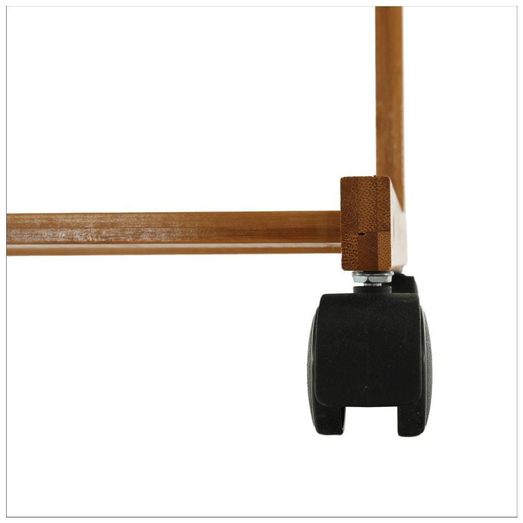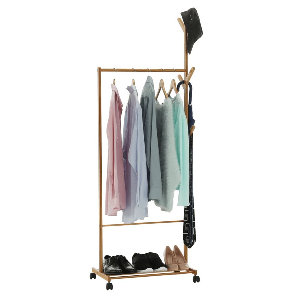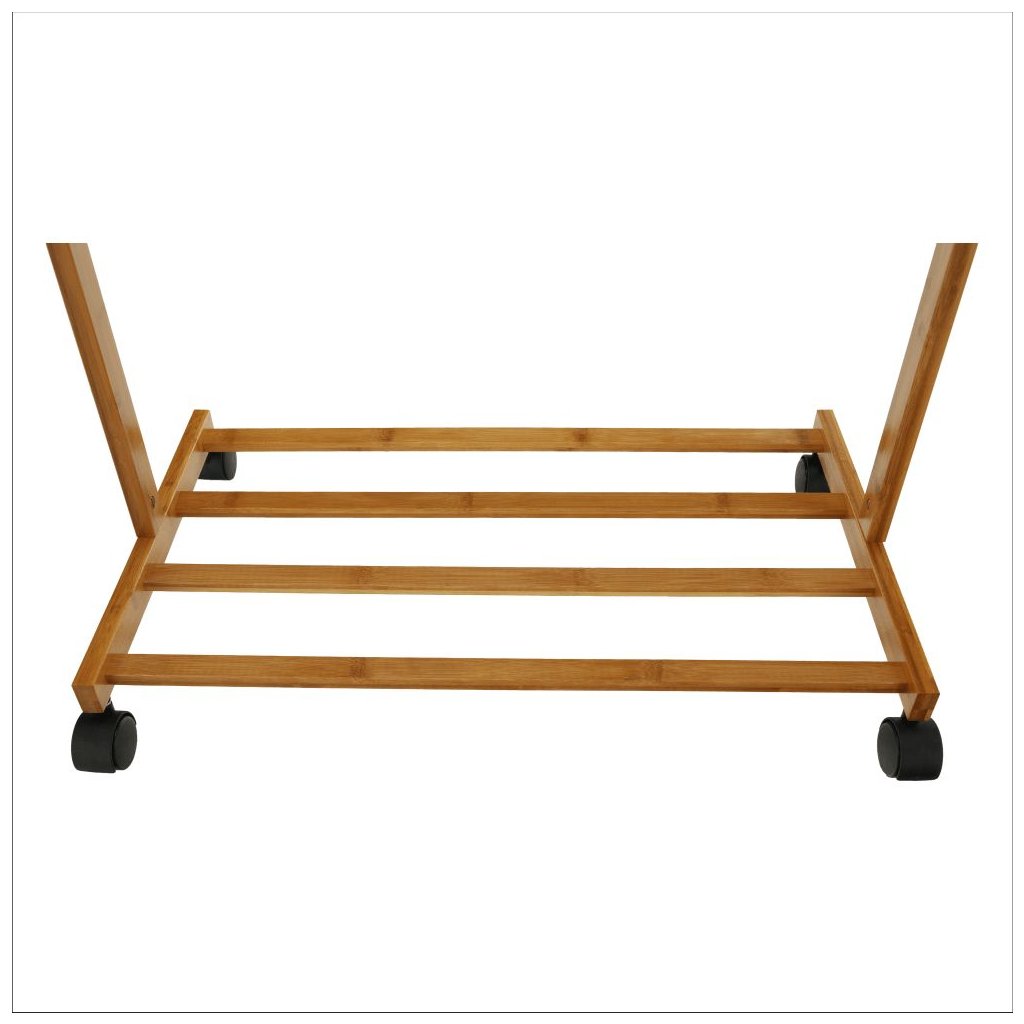 Stojan na šaty VIKIR je praktický a štýlový doplnok do vášho interiéru. Vyrobený z bambusu, ponúka vešiakový tyč, spodnú policu a šesť háčikov. S nosnosťou 15 kg a štyrmi kolieskami je ľahko presunute