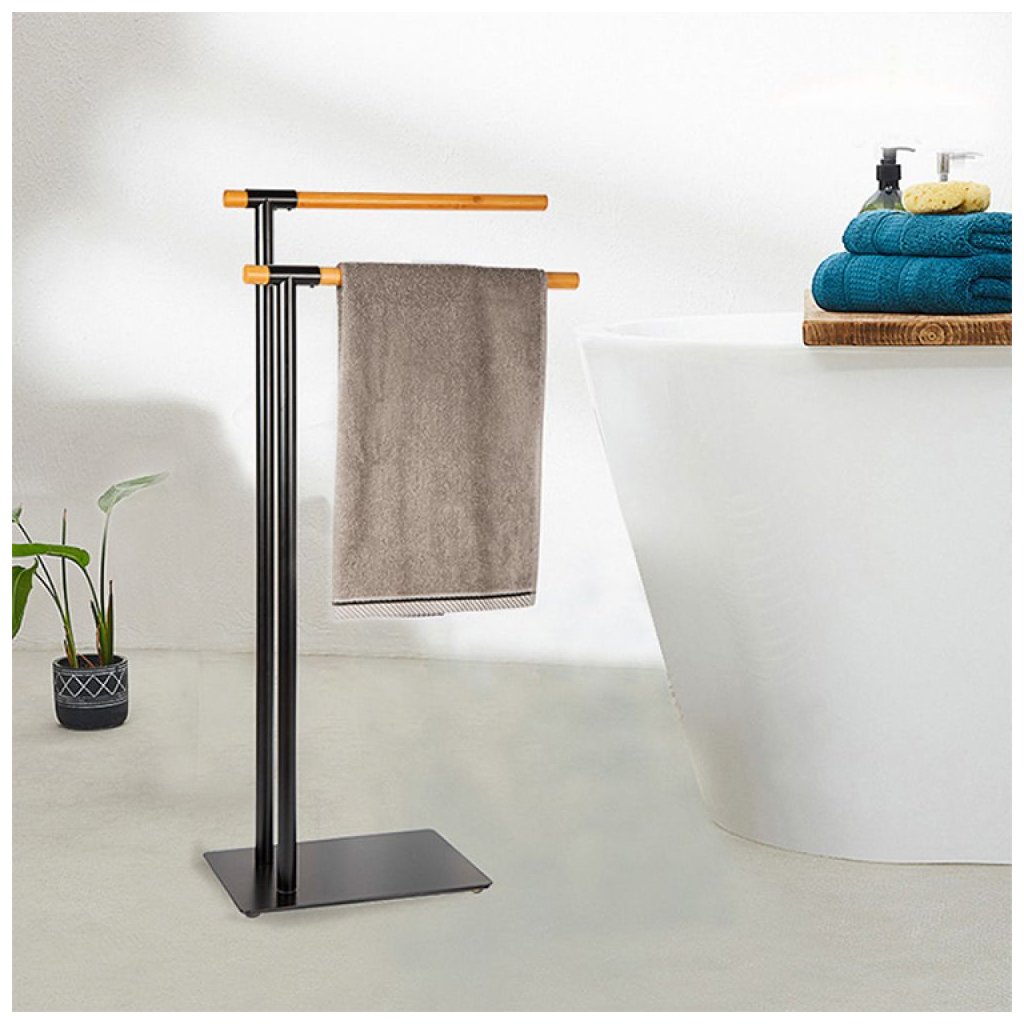 Vyrobený z kvalitného kovu a bambusu, stojan je odolný a ľahko sa udržiava. Jeho montáž je jednoduchá a rýchla, takže si ho môžete zostaviť bez akýchkoľvek problémov. S dvomi odkladacími lištami poskytuje dostatok priestoru pre všetky vaše uteráky, čím zabezpečuje ich pohodlné uskladnenie.