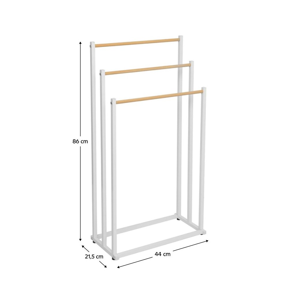Stojan na uteráky POLDO v bielej farbe je praktickým doplnkom do kúpeľne. Trojradový dizajn z kovu s rozmermi 44x21,5x86 cm ponúka dostatok miesta. Dodávané v demonte.