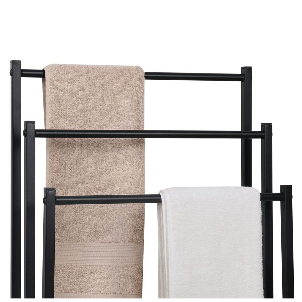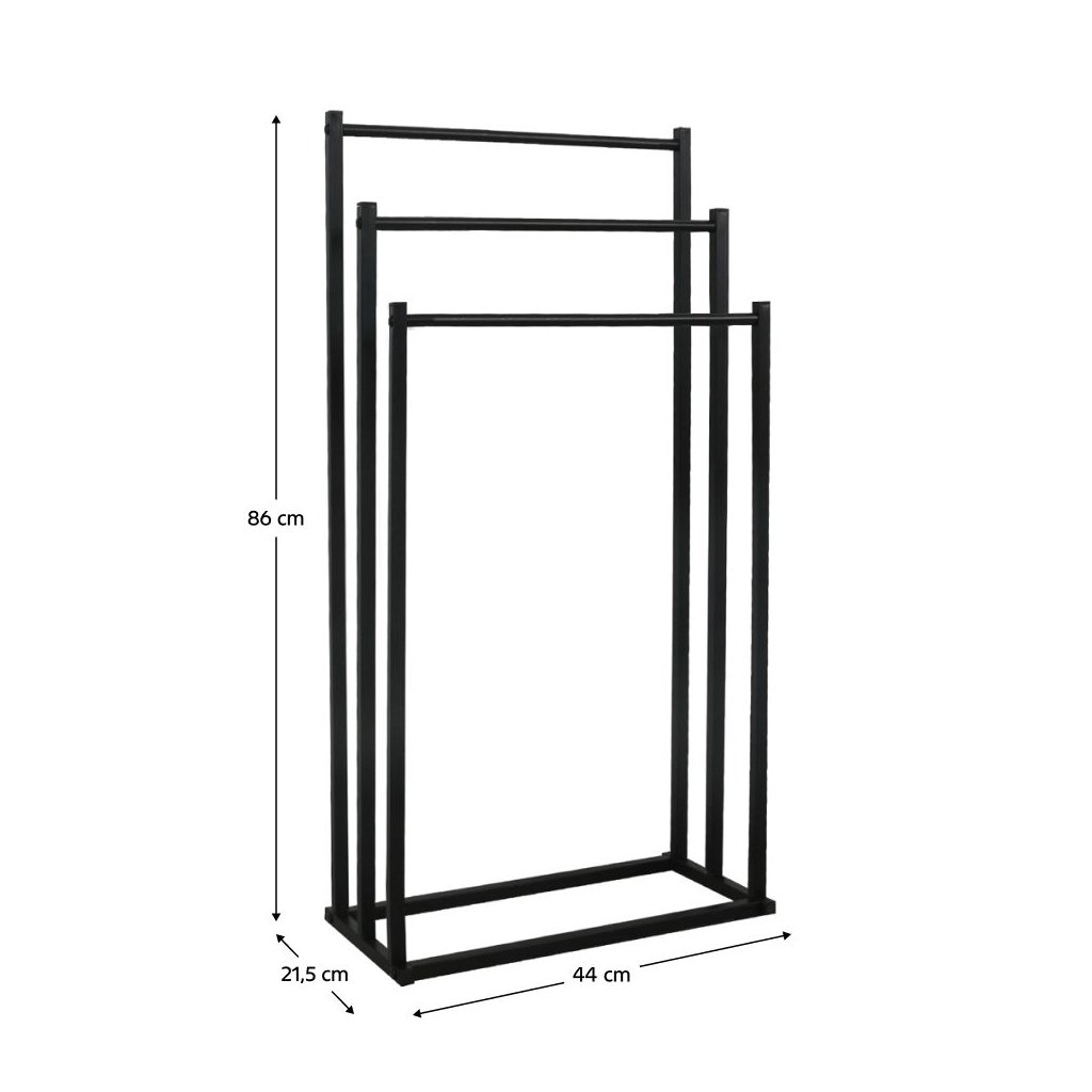Praktický stojan na uteráky v čiernej farbe z kovu. Trojradový dizajn s rozmermi 44x21,5x86 cm. Dodávaný v demonte, ideálny pre úsporu priestoru v kúpeľni.