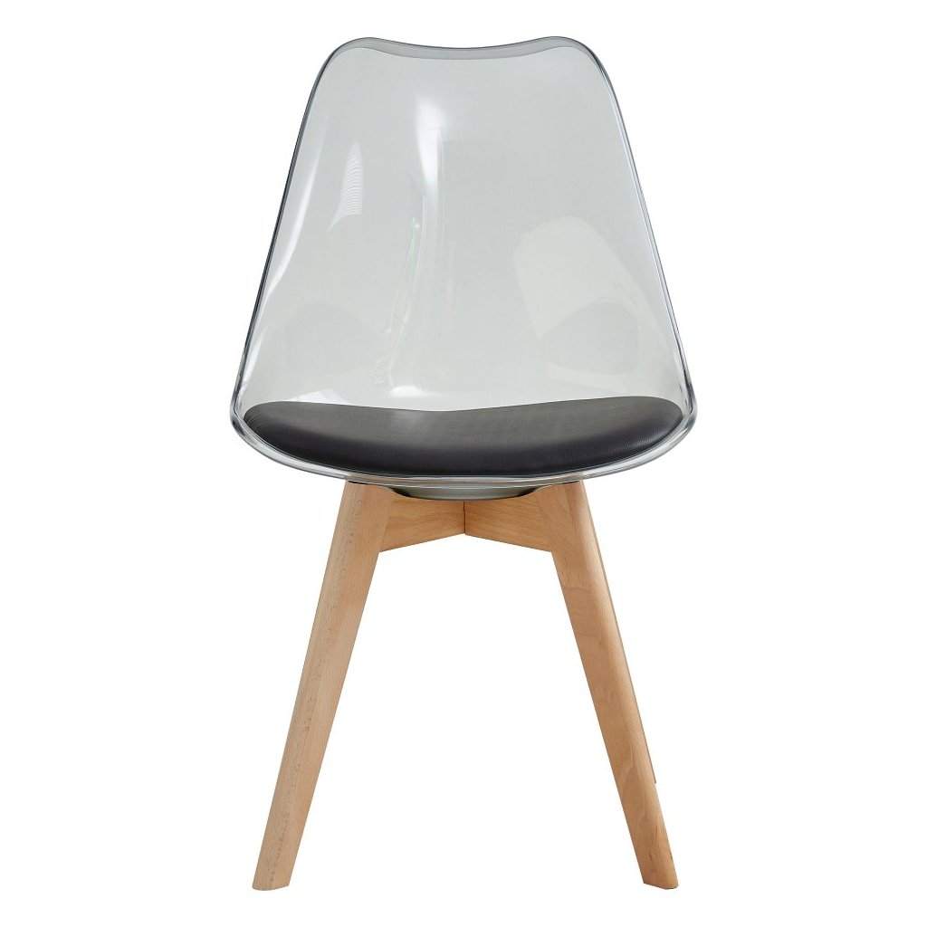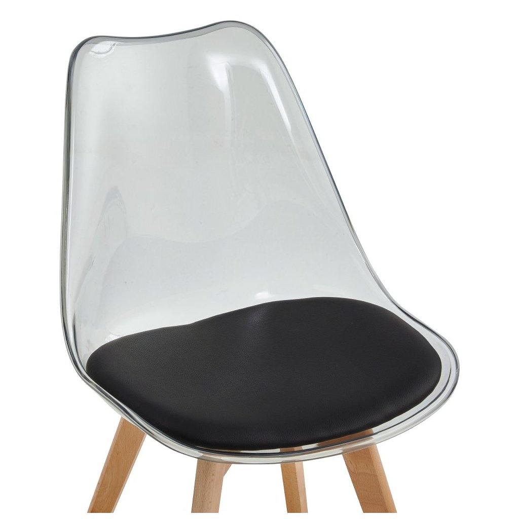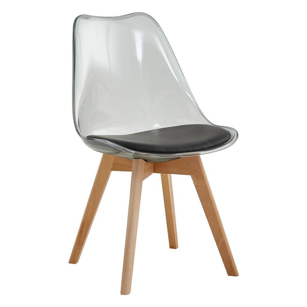 Jedálenská stolička BALI v transparentnej čiernej farbe kombinuje akryl, ekokožu a bukové drevo. Extra mäkké sedenie a moderný dizajn zabezpečia komfort a štýlový vzhľad vašej jedálne.