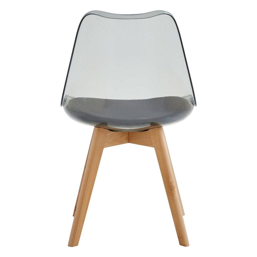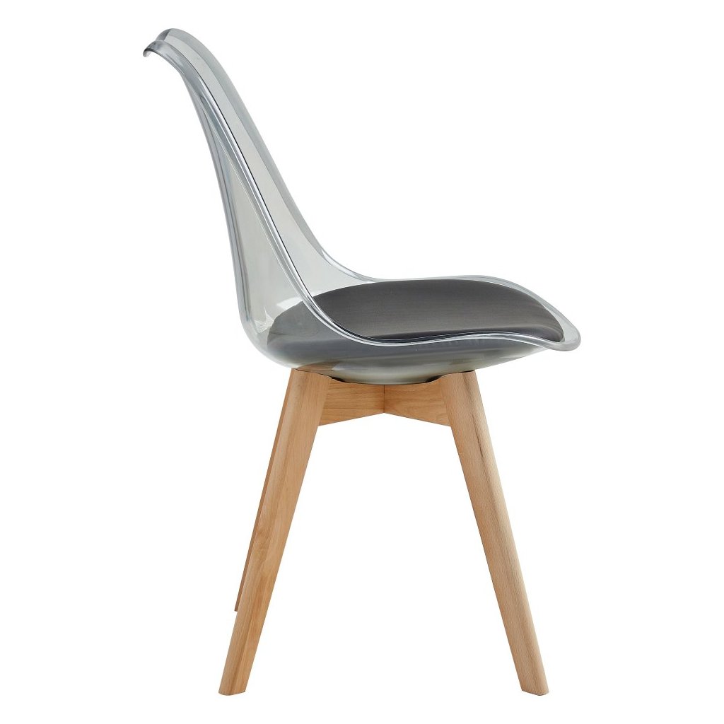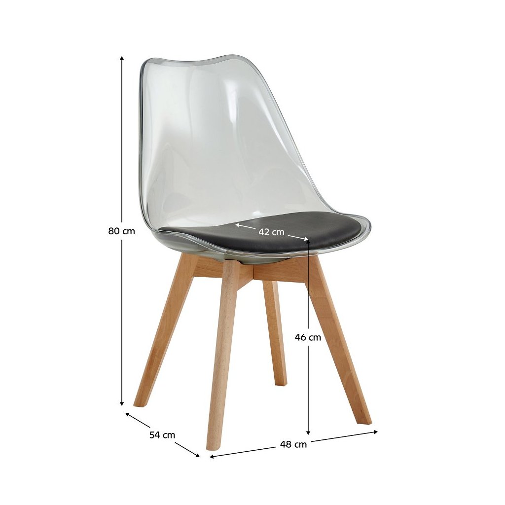 Jedálenská stolička BALI v transparentnej čiernej farbe kombinuje akryl, ekokožu a bukové drevo. Extra mäkké sedenie a moderný dizajn zabezpečia komfort a štýlový vzhľad vašej jedálne.