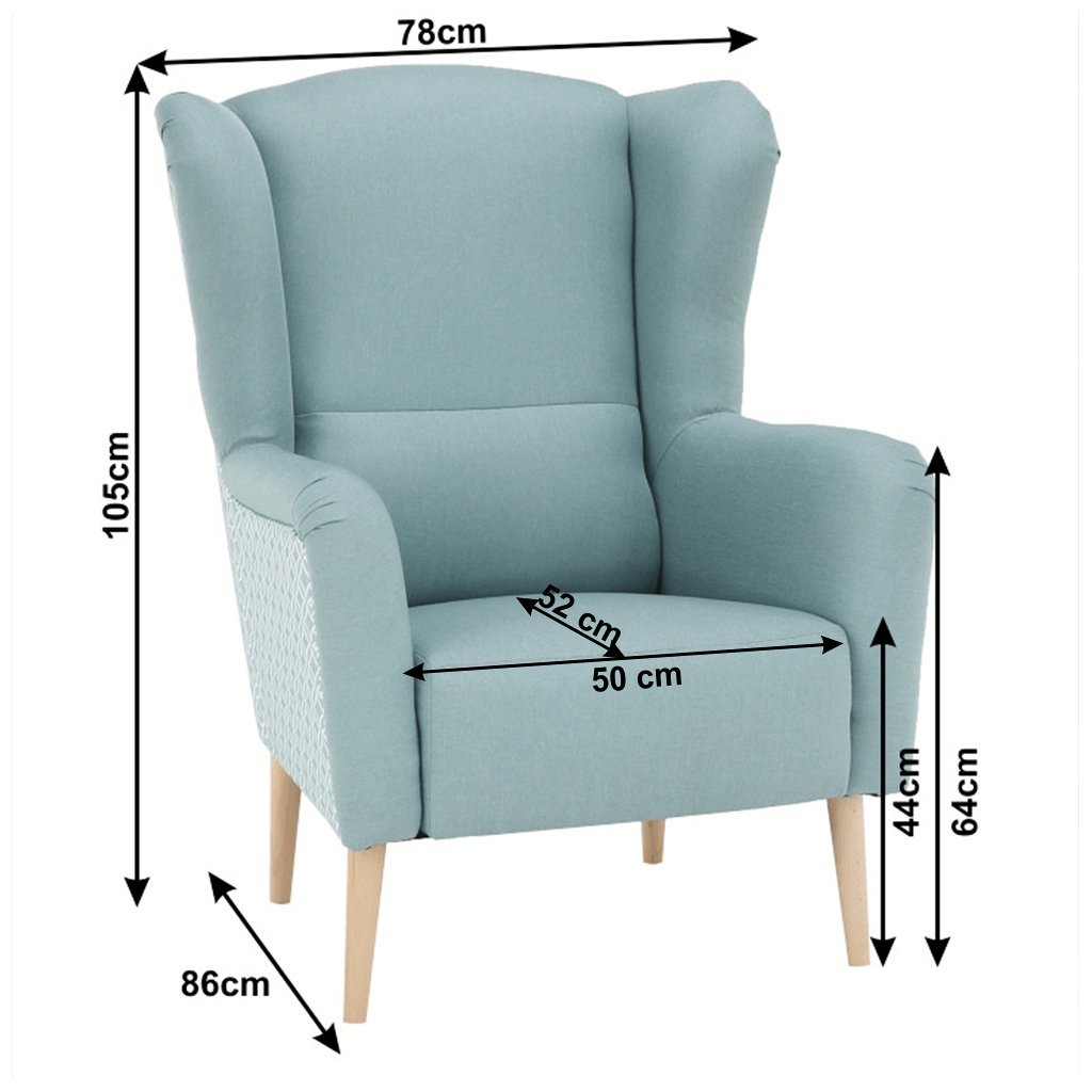 Ušiakové kreslo BELEK v mentolovej látke spojuje moderný dizajn a kvalitné spracovanie. Nosnosť 120 kg, pevná konštrukcia a drevené nohy zaručujú stabilitu. Rozmery: 78x86x105 cm.