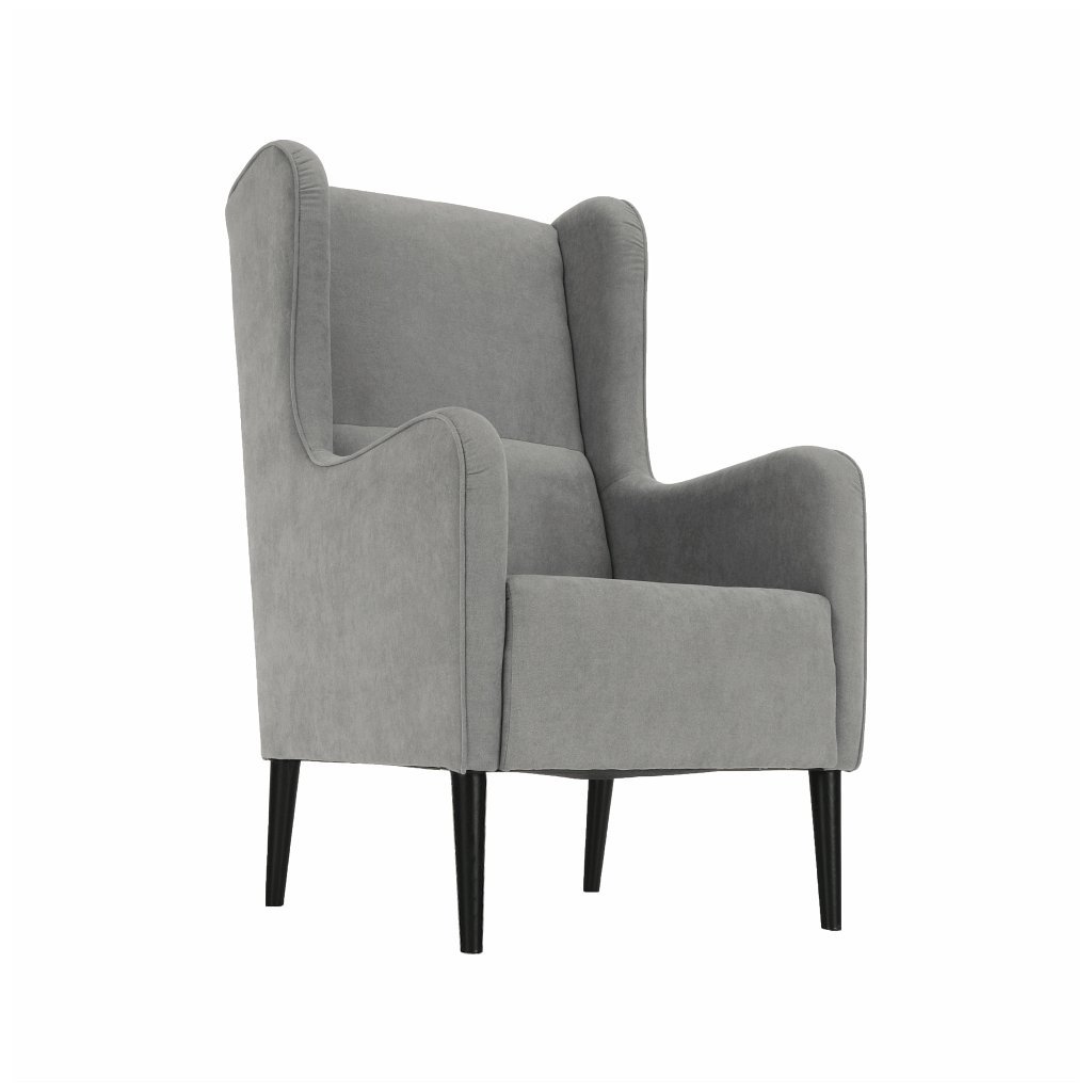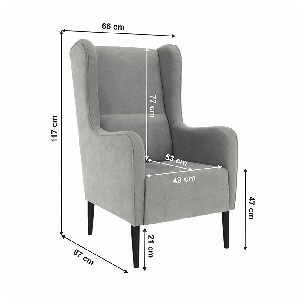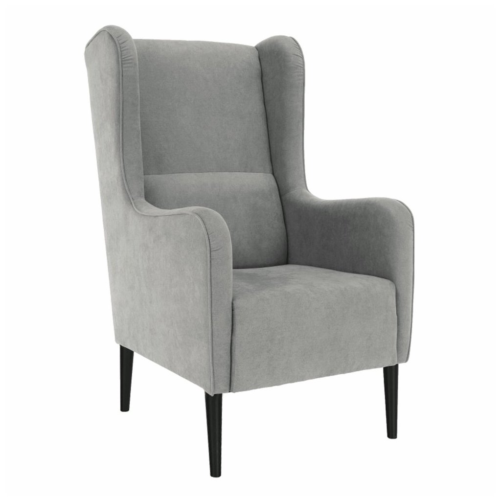 Ušiakové kreslo BREDLY v elegantnej sivej látke zaujme svojou výškou 117 cm a stabilnými čiernymi drevenými nohami. Ideálne pre relaxáciu s nosnosťou do 120 kg. Rozmery: 66x87x117 cm.