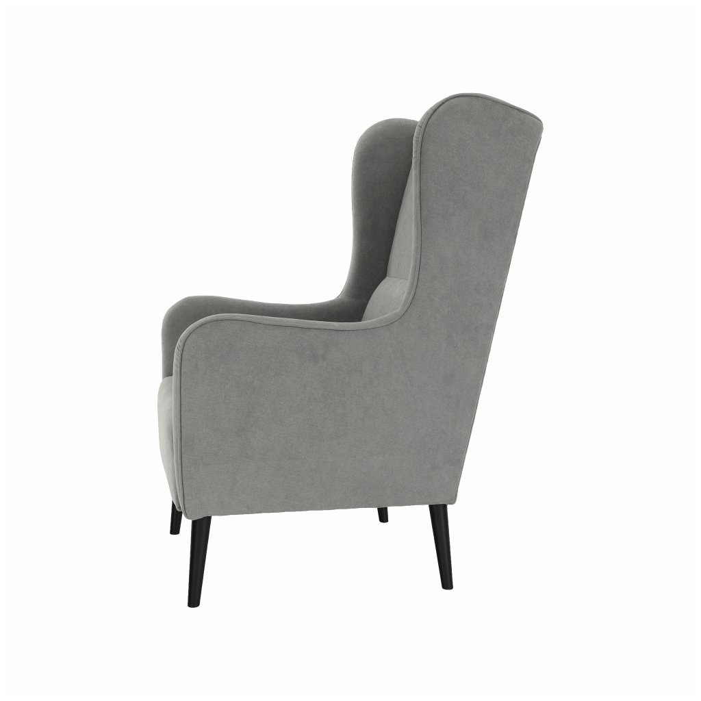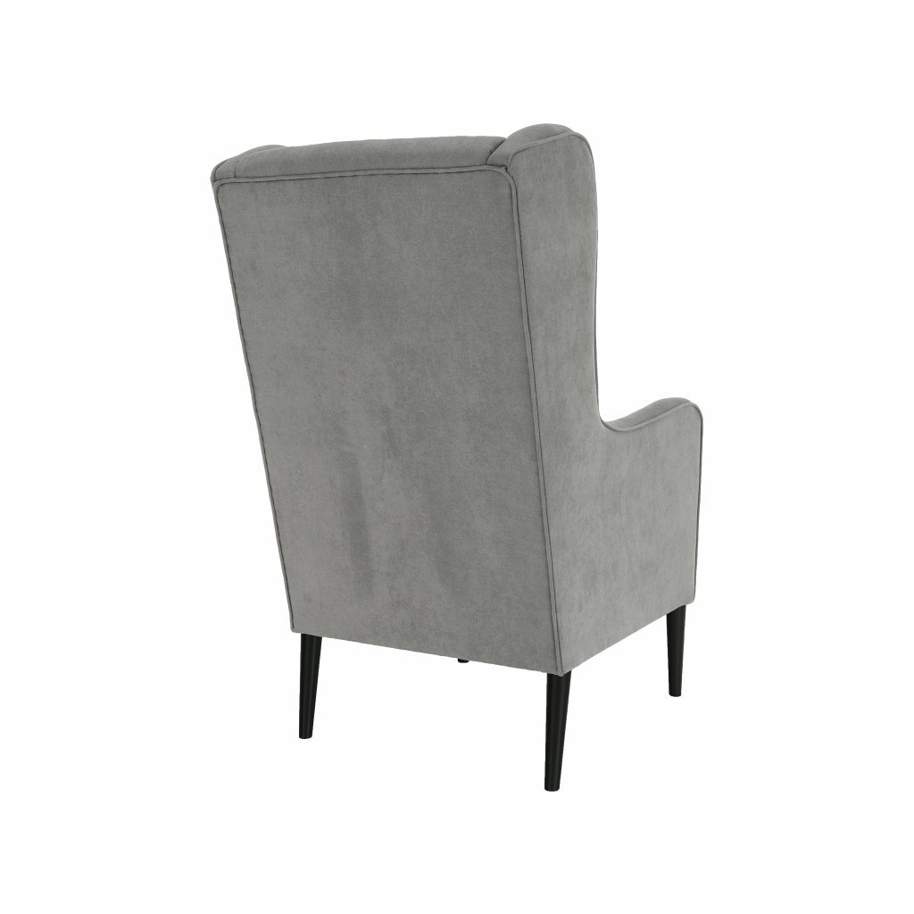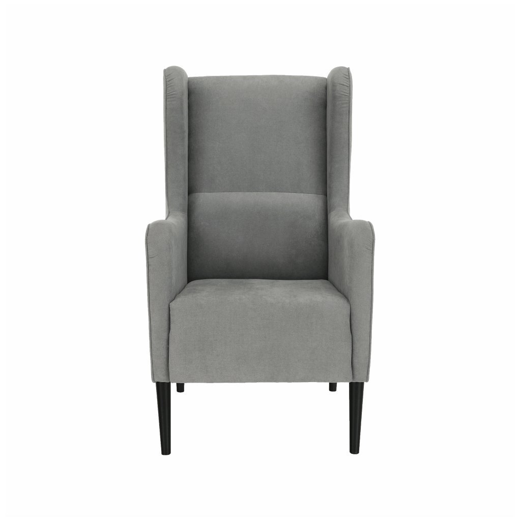 Ušiakové kreslo BREDLY v elegantnej sivej látke zaujme svojou výškou 117 cm a stabilnými čiernymi drevenými nohami. Ideálne pre relaxáciu s nosnosťou do 120 kg. Rozmery: 66x87x117 cm.
