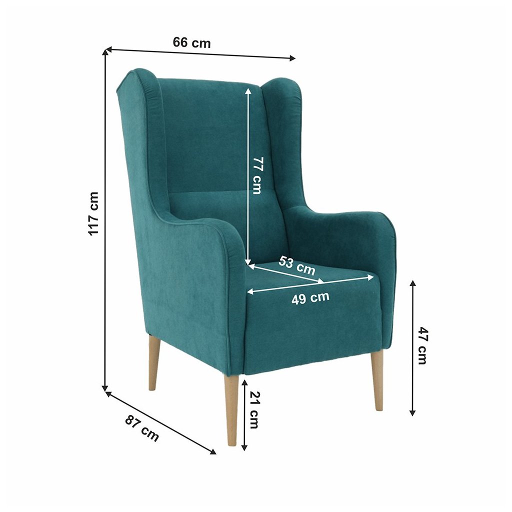 Ušiakové kreslo BREDLY v atraktívnej tyrkysovej látke je elegantným doplnkom do každého interiéru. S výškou 117 cm a stabilnými bukovými nohami ponúka pohodlie a štýl. Rozmery: 66x87x117 cm, nosnosť 1