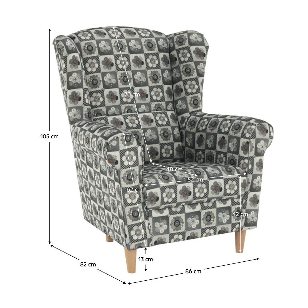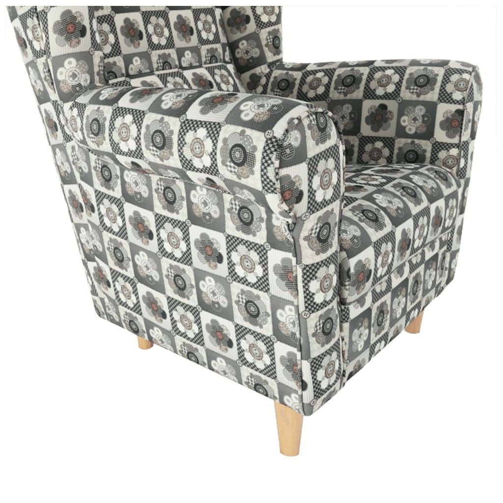 Dizajnové ušiakové kreslo CHARLOT v štýle patchwork N1 je pohodlným doplnkom do vášho domova. Vysoká opierka chrbta a mohutné opierky rúk zabezpečia komfort a podporu. Drevené nožičky dodávajú stabilitu