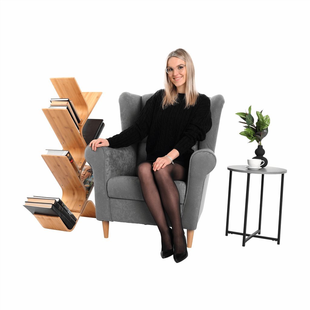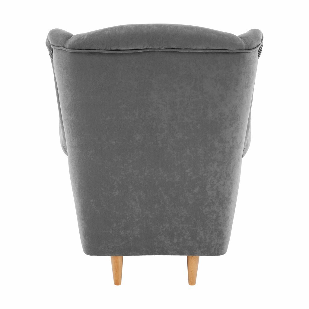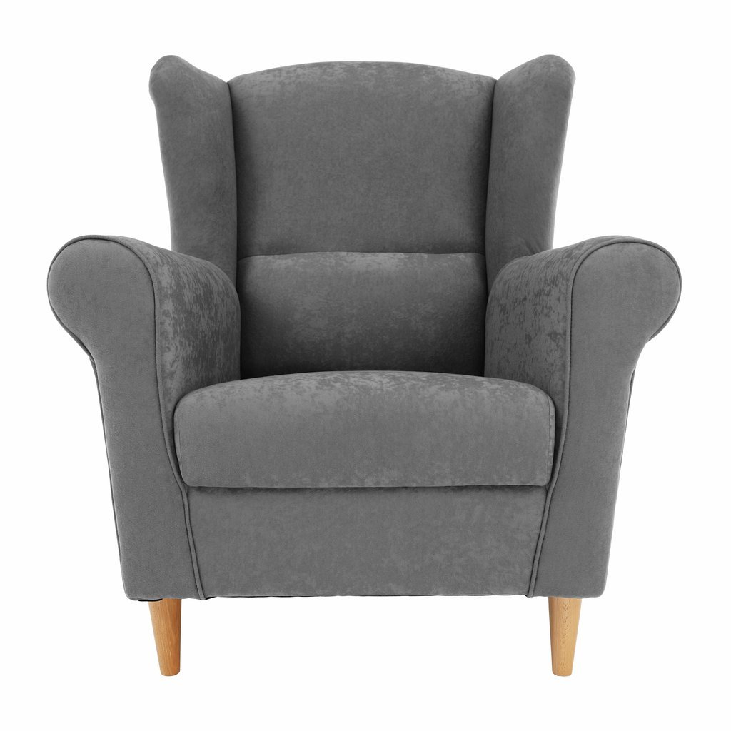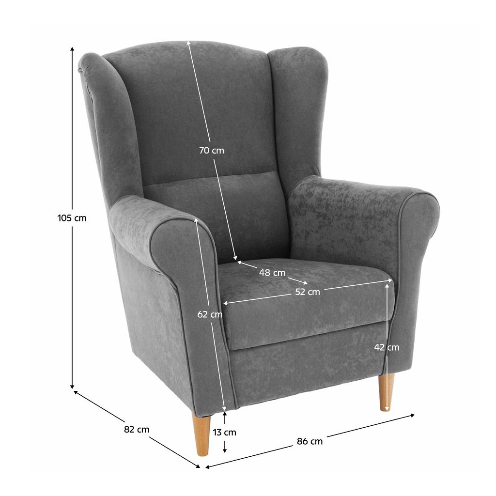 Ušiakové kreslo CHARLOT v sivej látke je štýlovým doplnkom pre váš domov. Vysoká opierka a mohutné podrúčky zabezpečuje pohodlie, zatiaľ čo PUR pena ponúka skvelú podporu. Drevené nožičky dodávajú sta