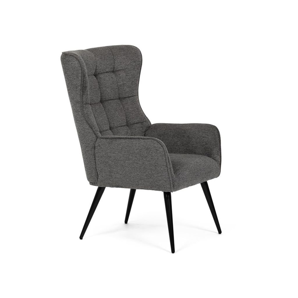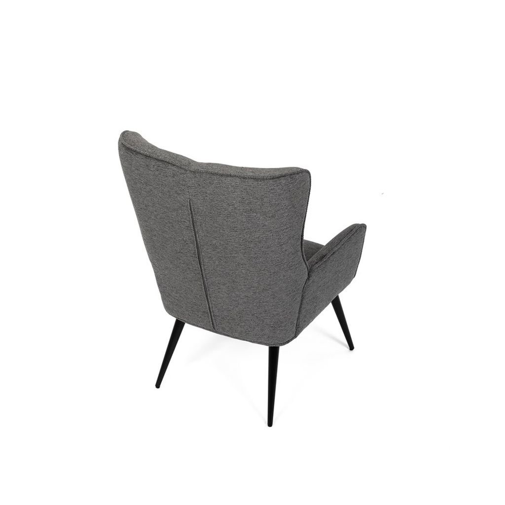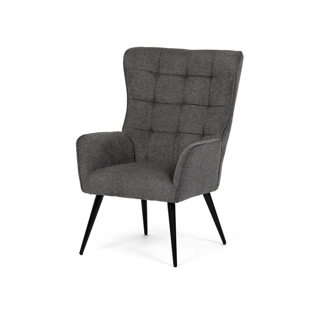 Ušiakové kreslo LEXY v sivej látke ponúka pohodlné sedenie s vodeodolným čalúnením a pevnými kovovými nohami. Moderný dizajn a masívny rám zabezpečujú stabilitu a štýlový vzhľad. Ideálne na relaxáciu.
