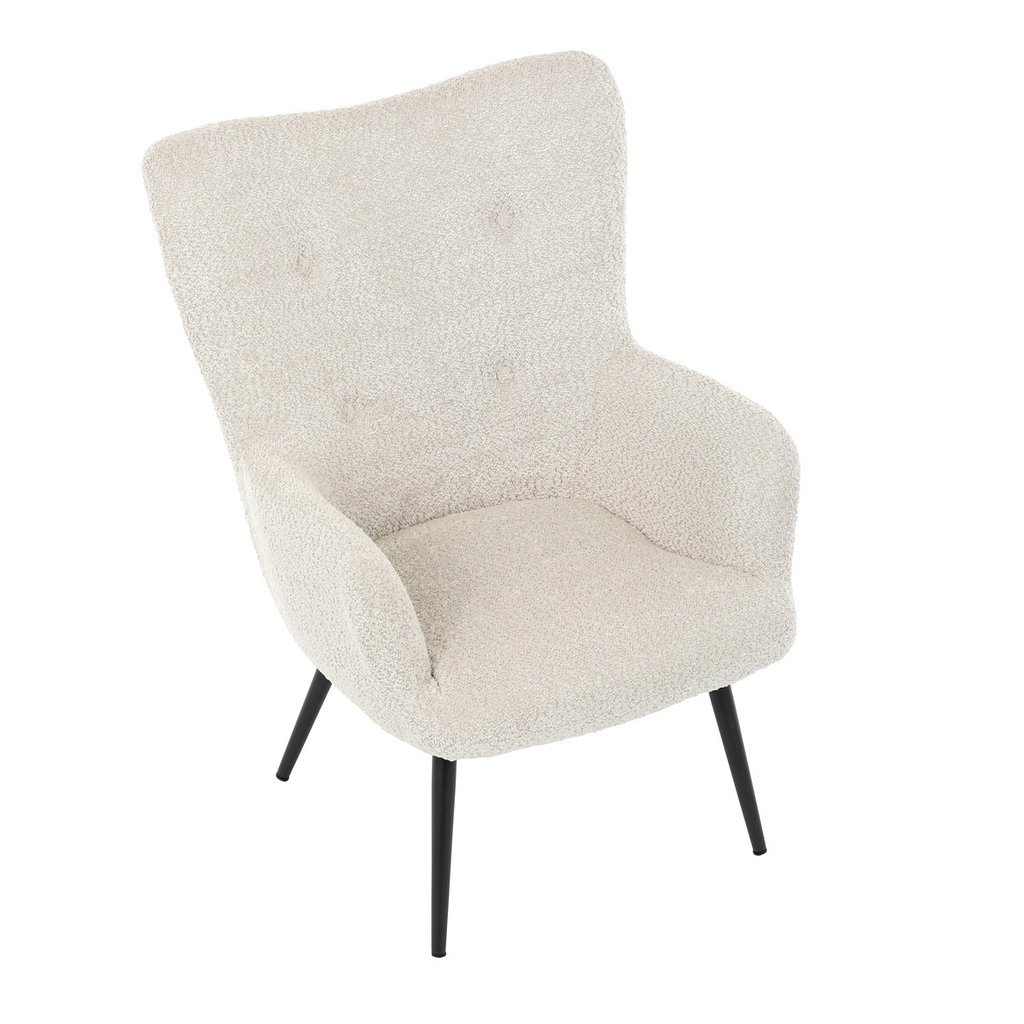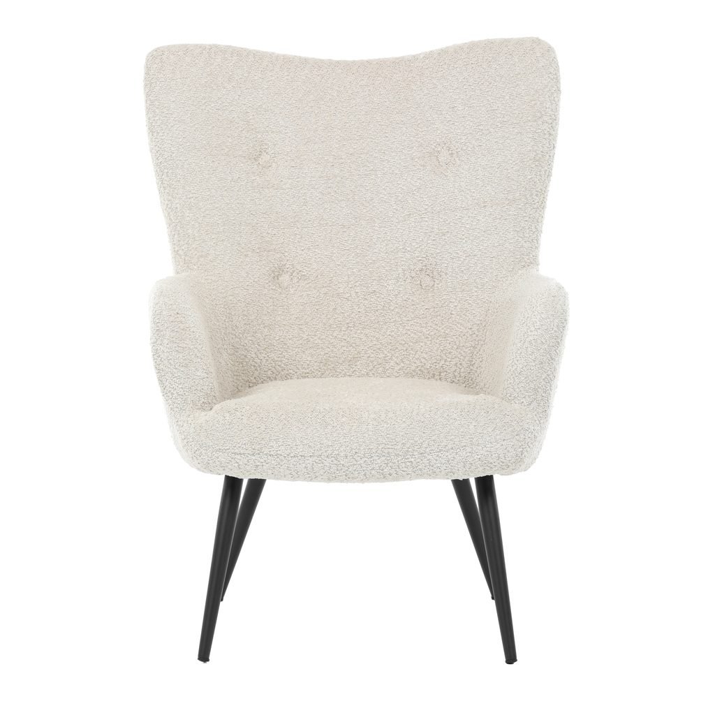 Ušiakové kreslo LUCAS prináša do každej obývačky dokonalú kombináciu pohodlia a moderného štýlu. Jeho béžové čalúnenie z látky Bouclé dodáva nádych elegancie, zatiaľ čo ergonomicky tvarované podrúčky a operadlo s jemnými gombíkmi zabezpečujú maximálny komfort pre vaše chvíle oddychu. Stabilné kovové nohy s čiernym povrchom dodávajú kreslu industriálny charakter a zaisťujú jeho trvanlivosť aj pri každodennom využívaní.