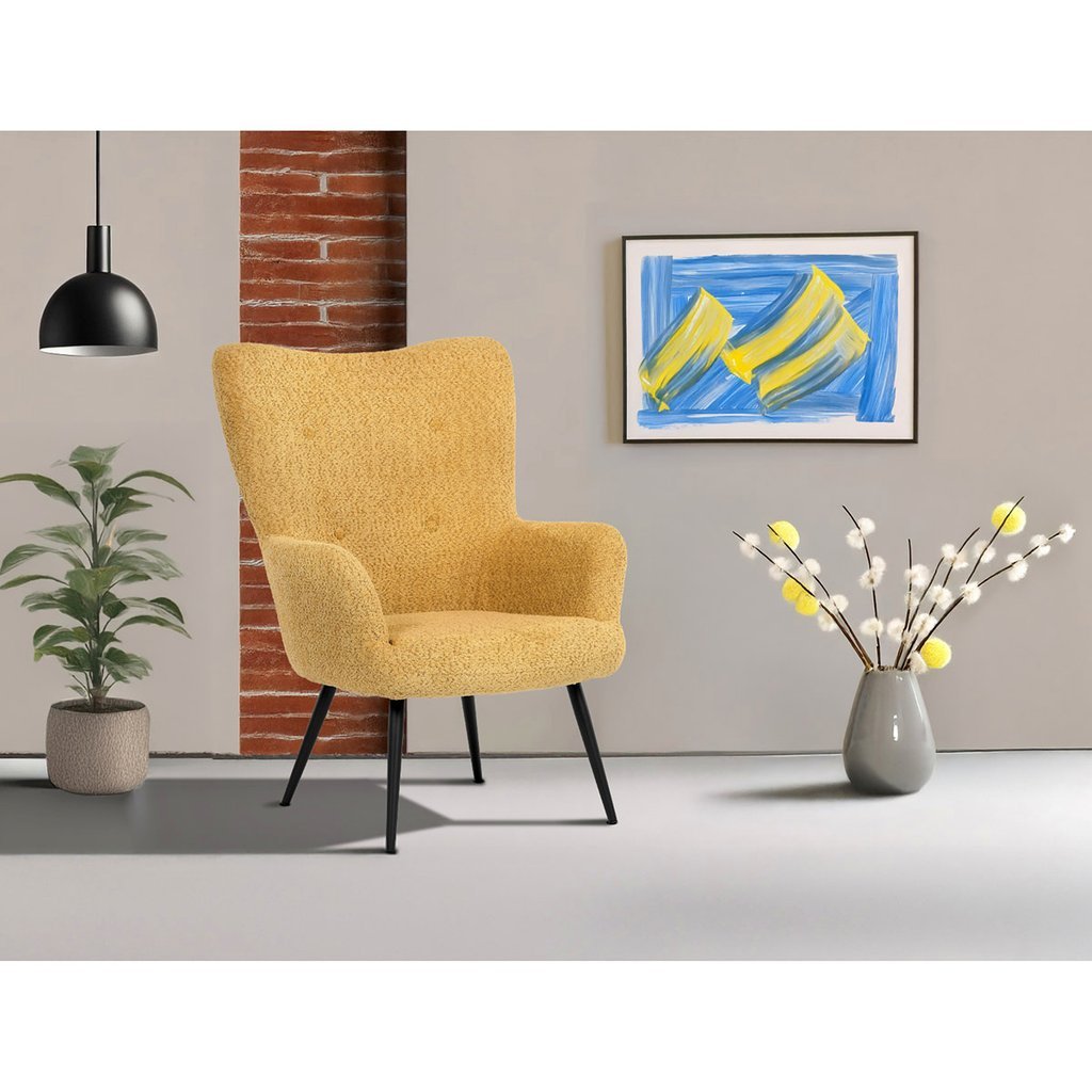Elegantné ušiakové kreslo LUCAS v žltej látke Bouclé vnesie do vášho domova jedinečný štýl a harmonické pohodlie. Jeho moderný dizajn sa skvele hodí do zariadenia v industriálnom štýle, pričom je ideálnym doplnkom do každej obývačky či kancelárie. Ergonomicky tvarované podrúčky a jemne prešívané operadlo zabezpečujú maximálny komfort, čo z kresla robí perfektného spoločníka pre relaxáciu pri knihách alebo posedenia s priateľmi.
