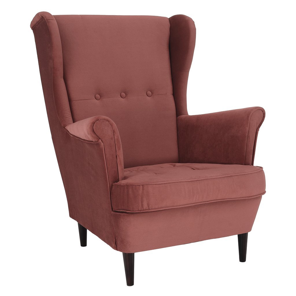 Ušiakové kreslo RUFINO v staroružovej látke dodá vašej obývačke štýlový nádych. Ergonomická opierka chrbta a mohutné opierky rúk zabezpečia pohodlie a relax. Elegantné drevené nožičky v orechovej farb