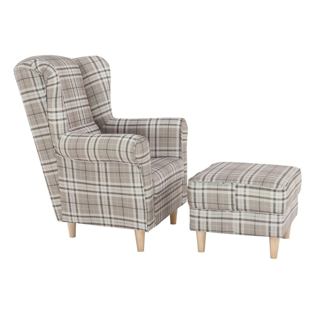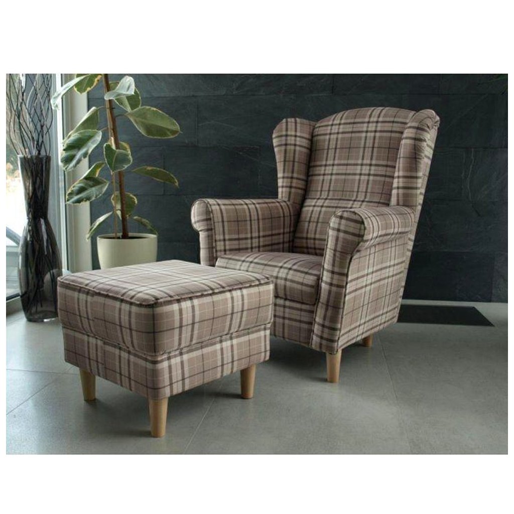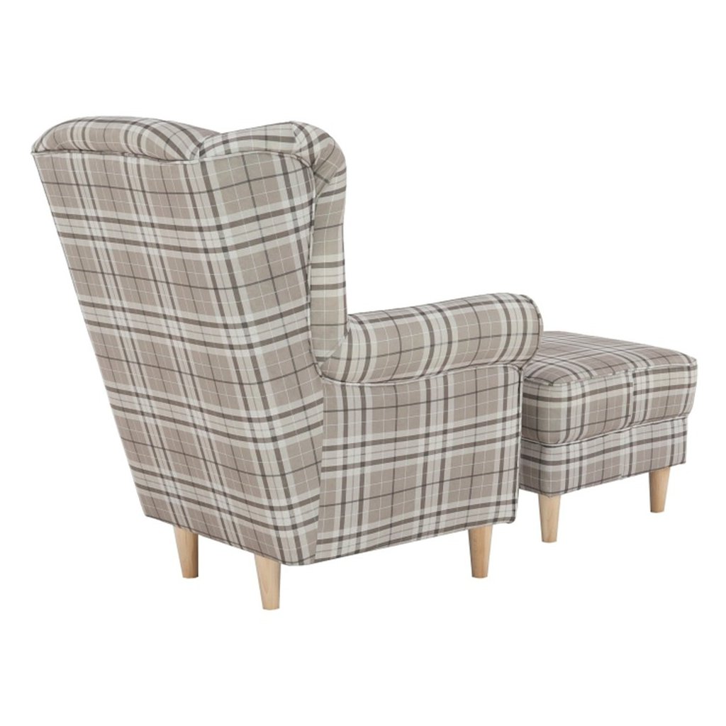 Ušiakové kreslo s taburetom - ASTRID, Vzor hnedé karo