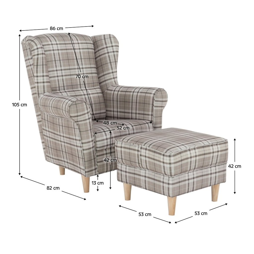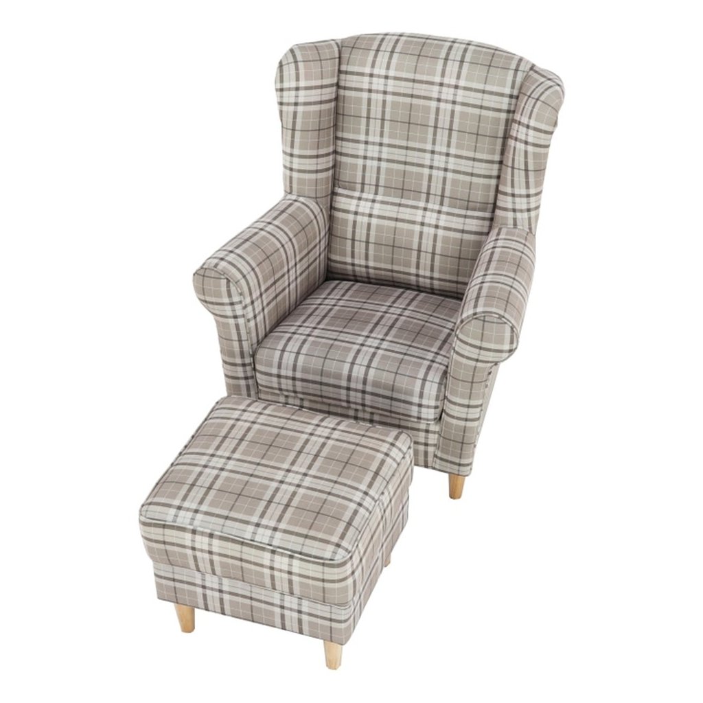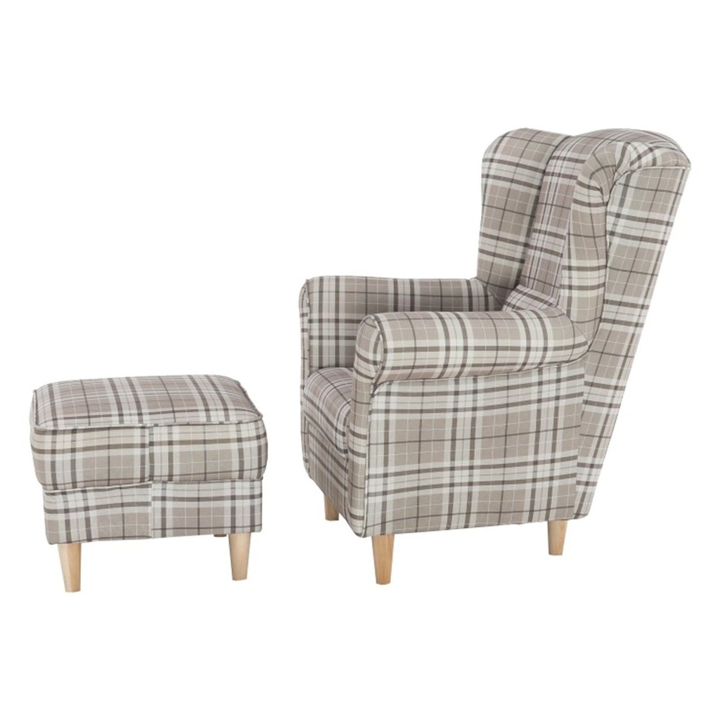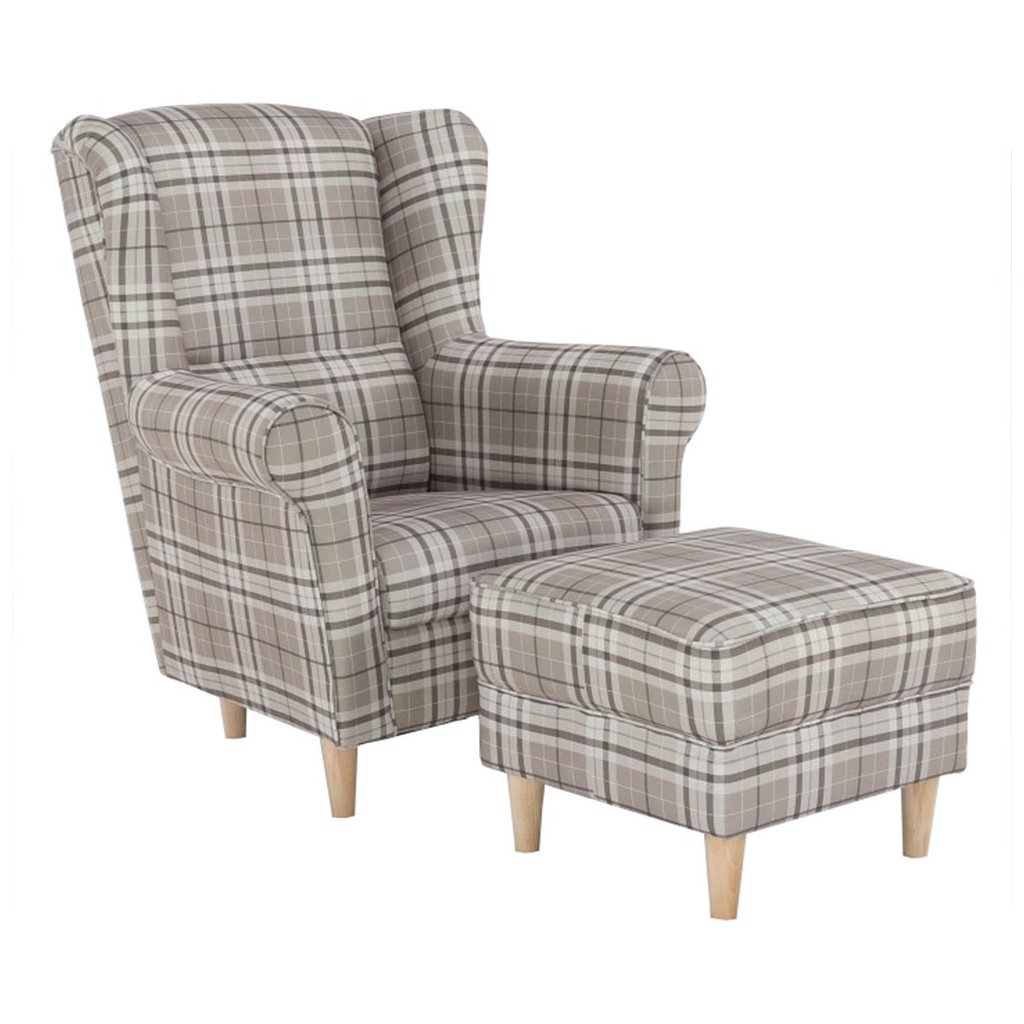 Ušiakové kreslo s taburetom - ASTRID, Vzor hnedé karo
