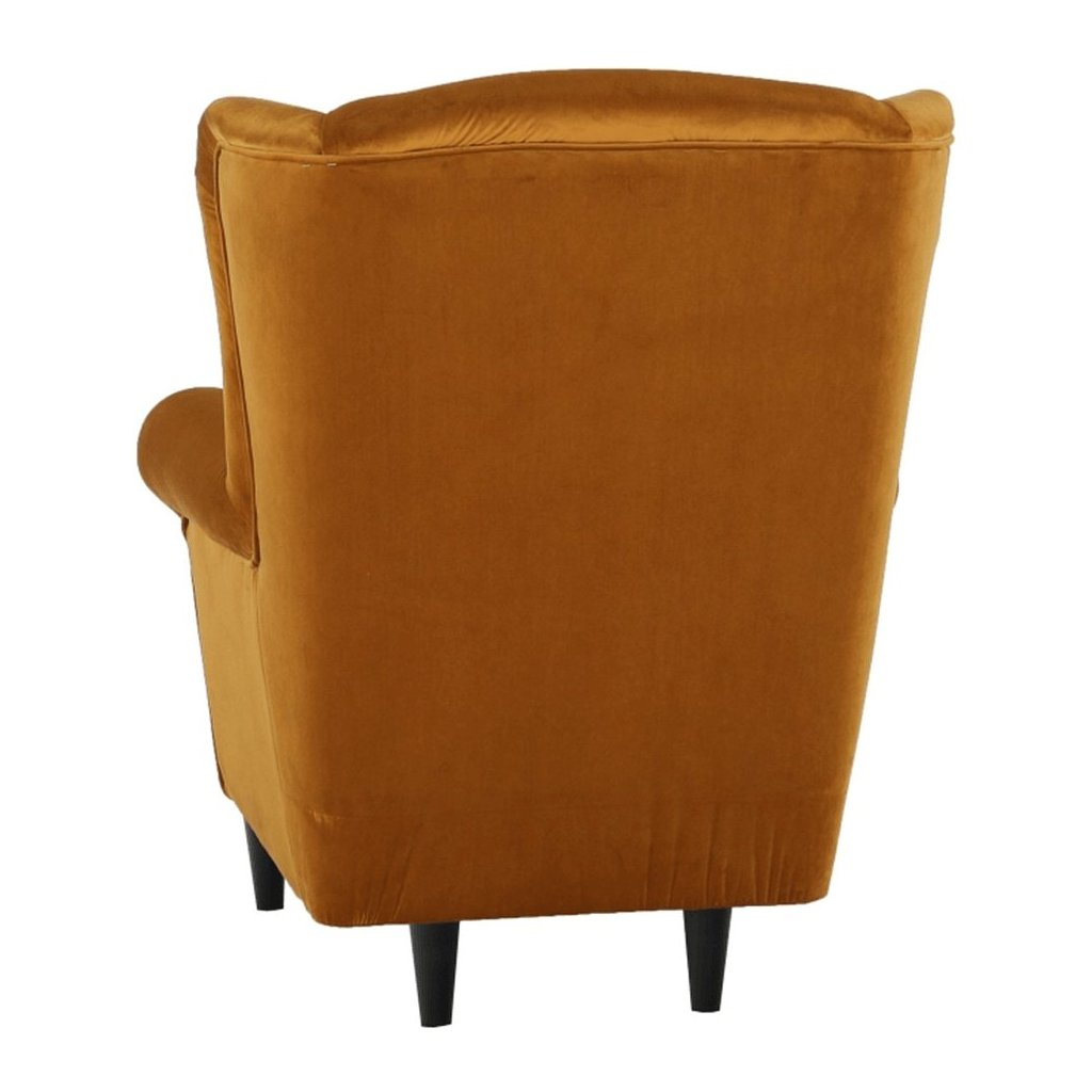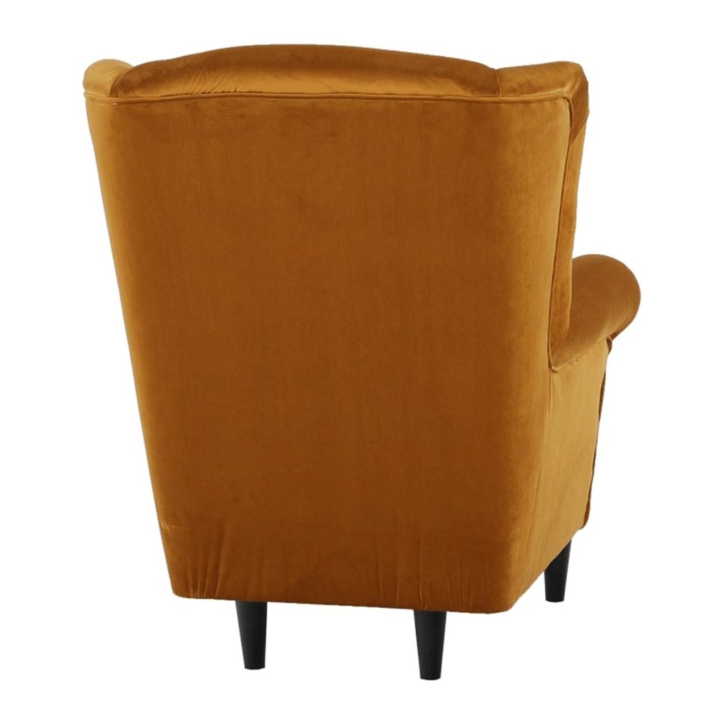 Ušiakové kreslo ASTRID v žltej látke je ideálne na relaxáciu. Široká sedacia časť a vysoké operadlo poskytujú dokonalú oporu. Súčasťou je praktický taburet pre úľavu nohám.