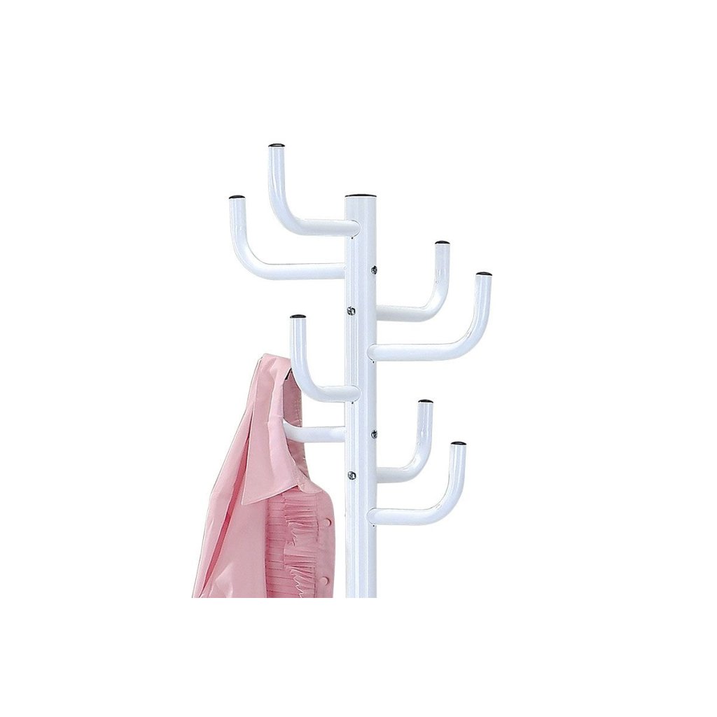 Stojanový vešiak s bielym lesklým povrchom ponúka praktické riešenie pre predsiene a kancelárie. S desiatimi háčikmi na troch úrovniach a stabilnou základňou. Výška 182 cm.