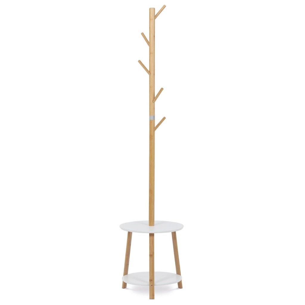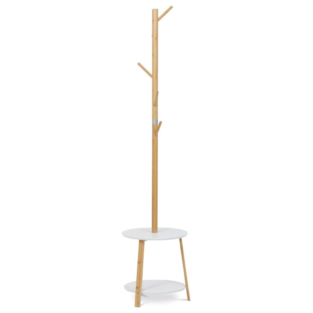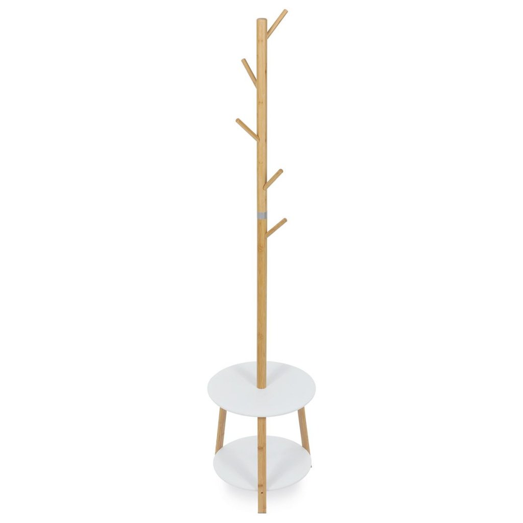 Elegantný stojanový vešiak v bielej farbe spája škandinávsky štýl s praktickým dizajnom. Vyrobený z kvalitného bambusu, ponúka stabilitu a dve odkladacie police pre dodatočný úložný priestor.