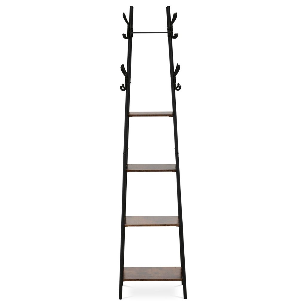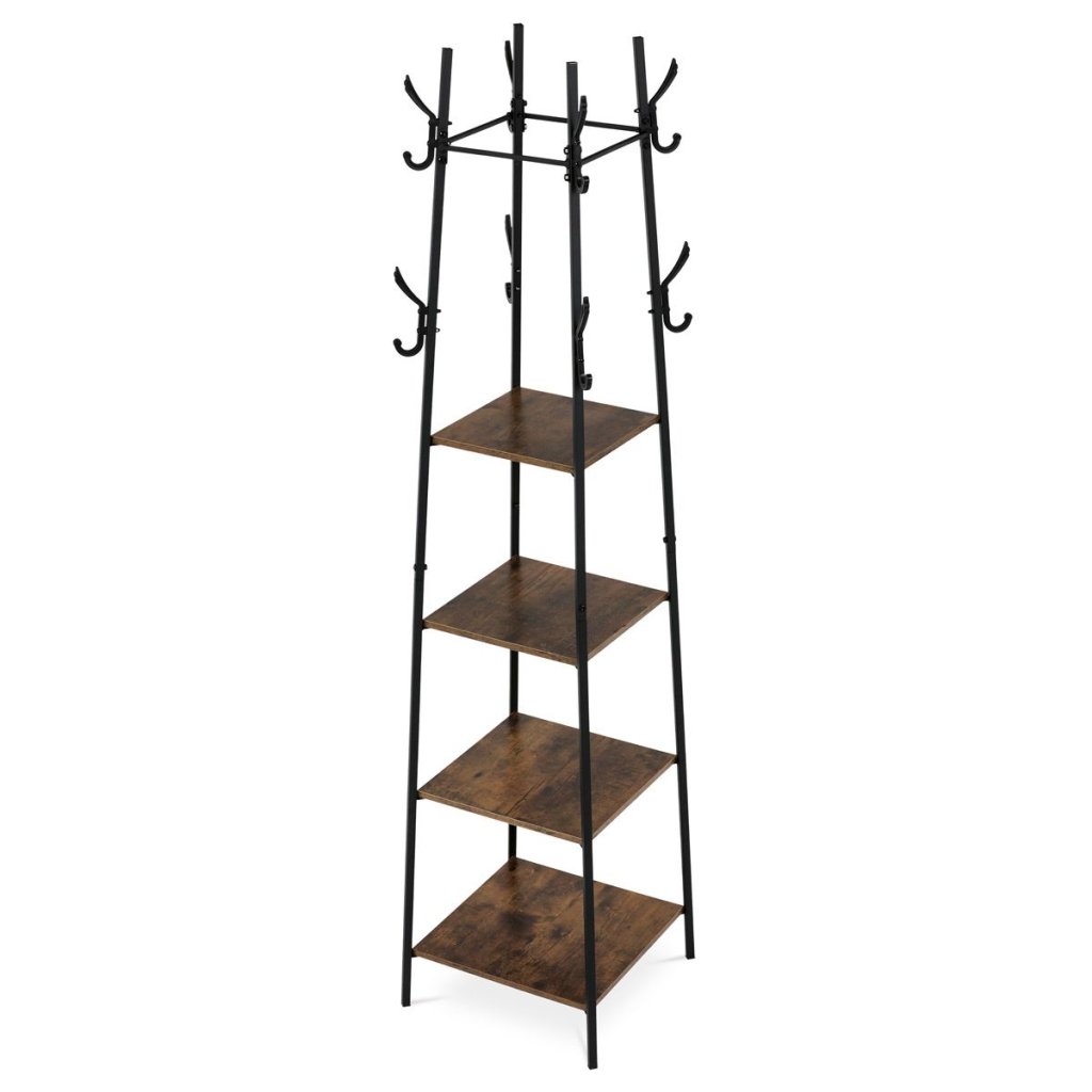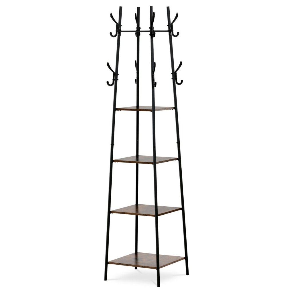 Vešiak s industriálnym dizajnom a kombináciou starého dreva a čierneho kovu je ideálny na organizáciu predsiene alebo spálne. Štyri police a háčiky poskytujú praktický a štýlový úložný priestor.