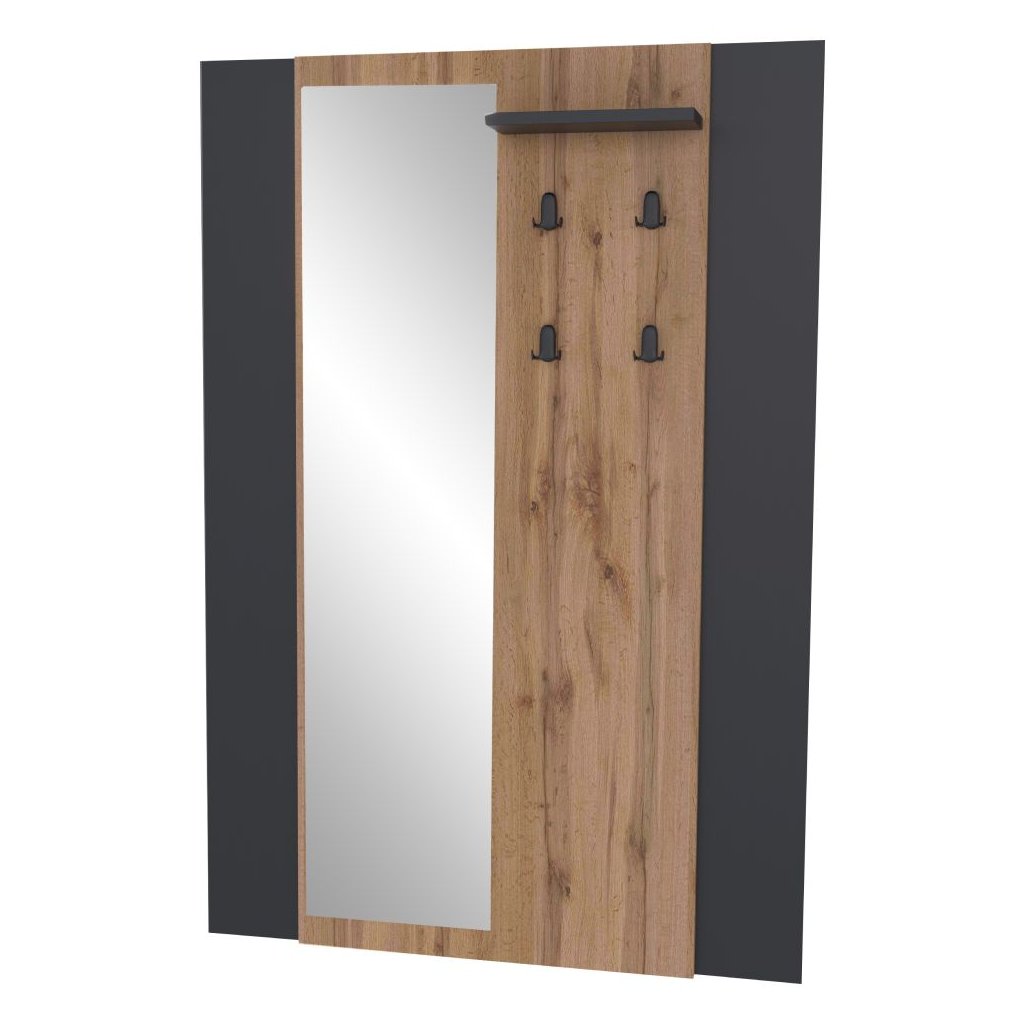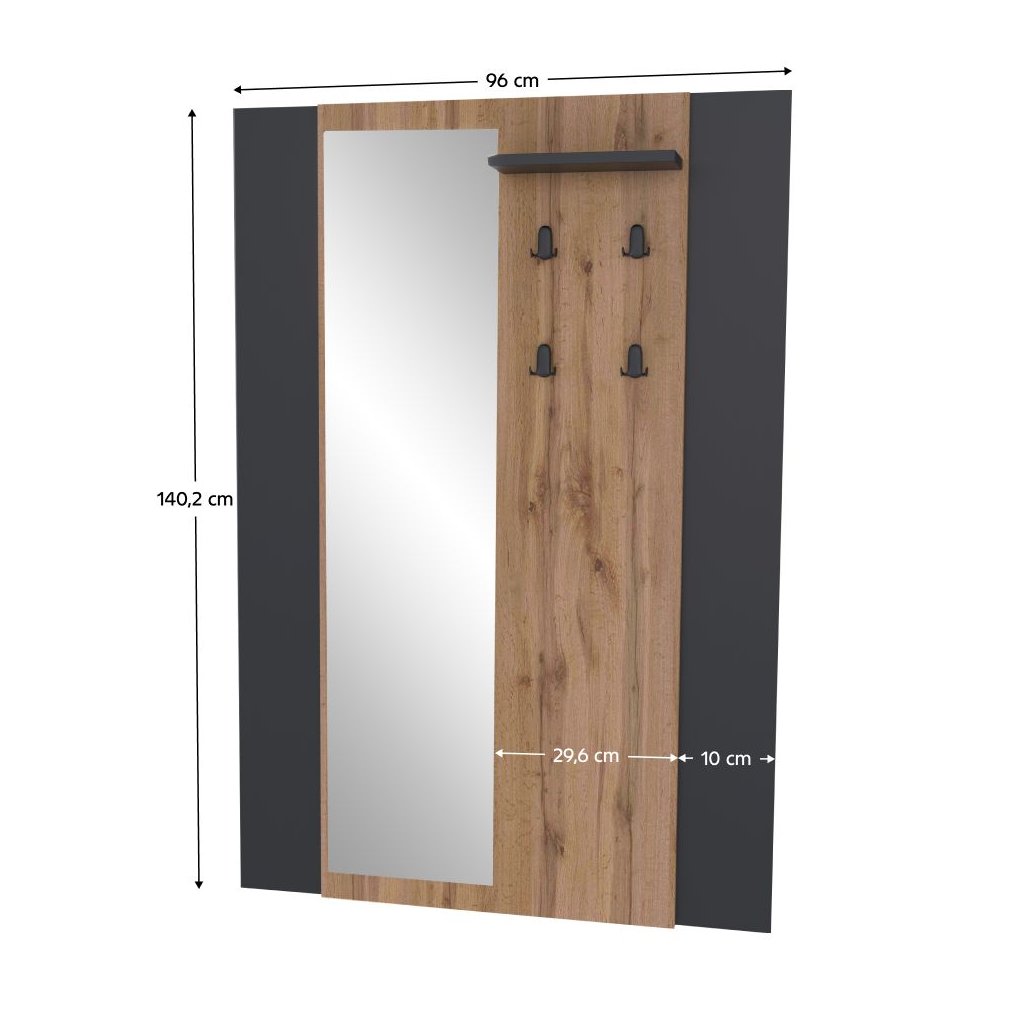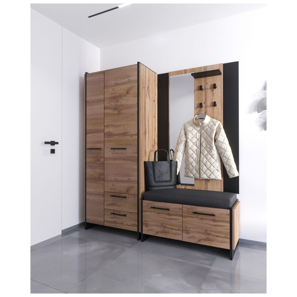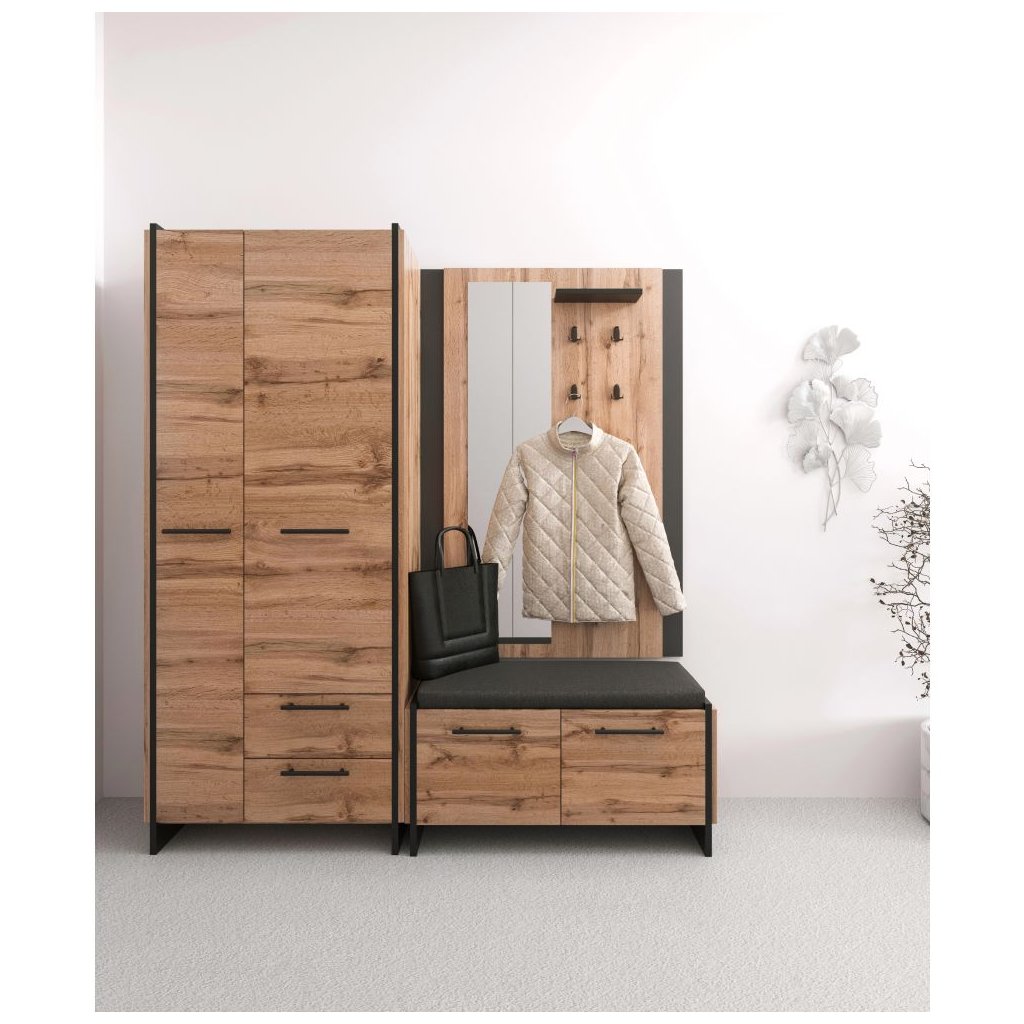 Vešiaková stena v dekore dub wotan a čiernej farbe ponúka moderný dizajn s úložným priestorom, policou a štyrmi háčikmi. Rozmery 96x30,5x140,2 cm, dodávané v demonte.