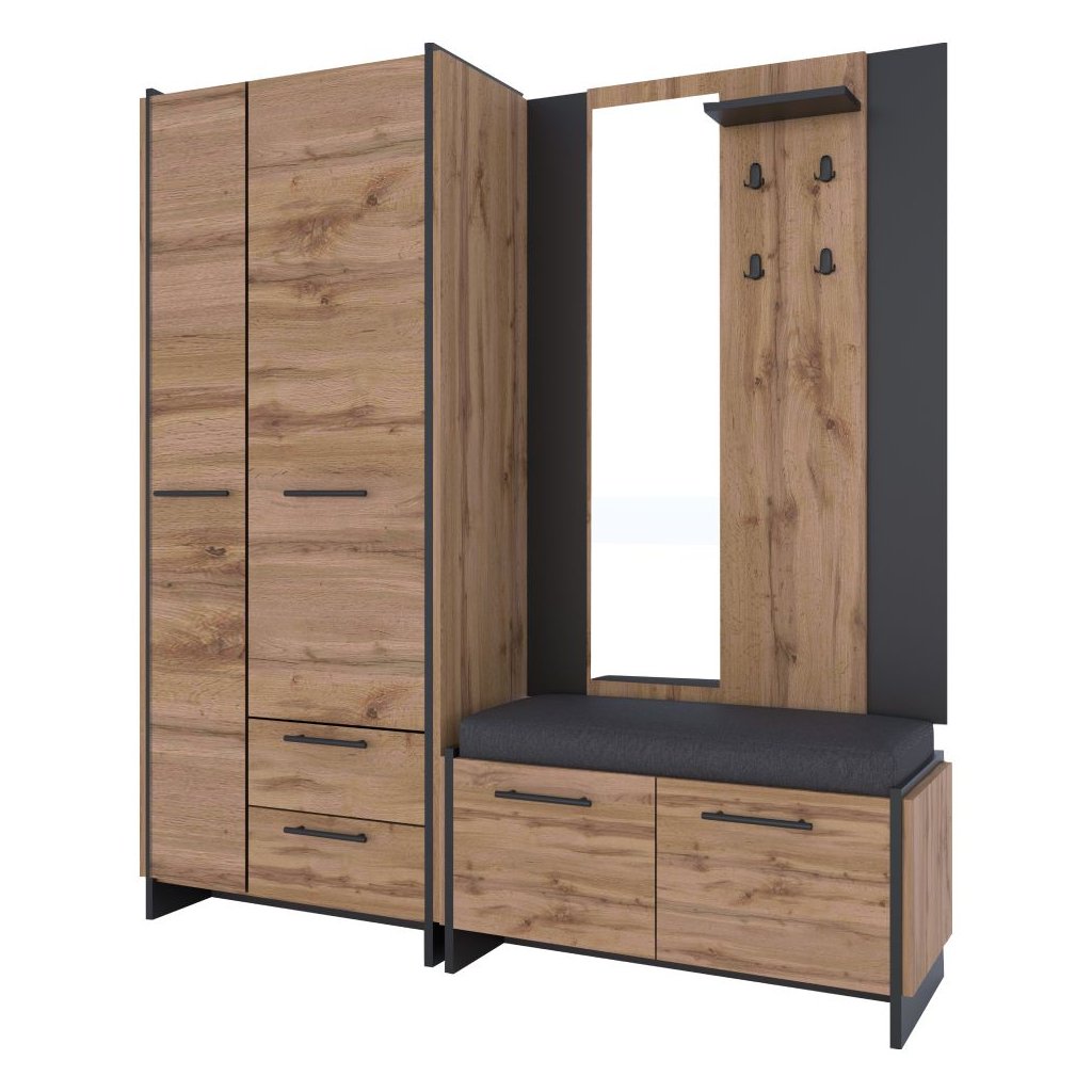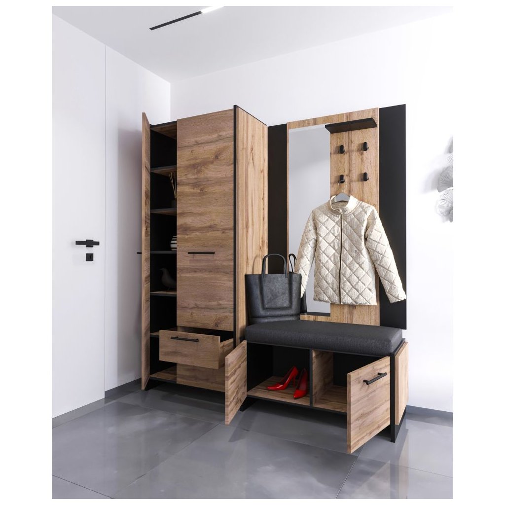 Vešiaková stena AMONI v atraktívnej kombinácii dub wotan a čiernej farby je ideálnym riešením pre moderné interiéry. Tento praktický kus nábytku ponúka dostatok úložného priestoru a štýlový dizajn, ktorý osvieži váš domov. S dôrazom na funkčnosť a estetiku sa stane neodmysliteľnou súčasťou vašej predsiene.