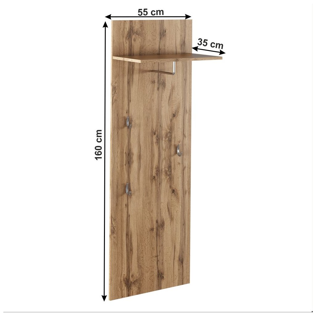 Vešiaková stena CYRIL v dekore dub wotan ponúka praktický úložný priestor s policou. Rozmery 55x35x160 cm, vyrobená z kvalitnej laminovanej DTD. Dodávaná v demonte.