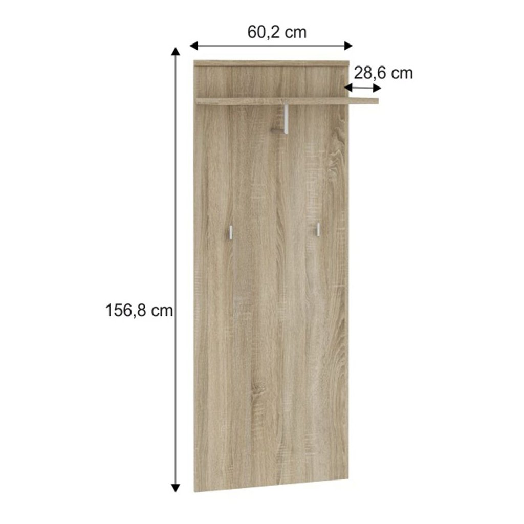 Vešiaková stena MARIO v dekore dub sonoma ponúka praktické riešenie do predsiene. S rozmermi 60,2x156,8x28,6 cm a hrúbkou materiálu 16/22 mm je ideálna na uskladnenie kabátov a doplnkov.
