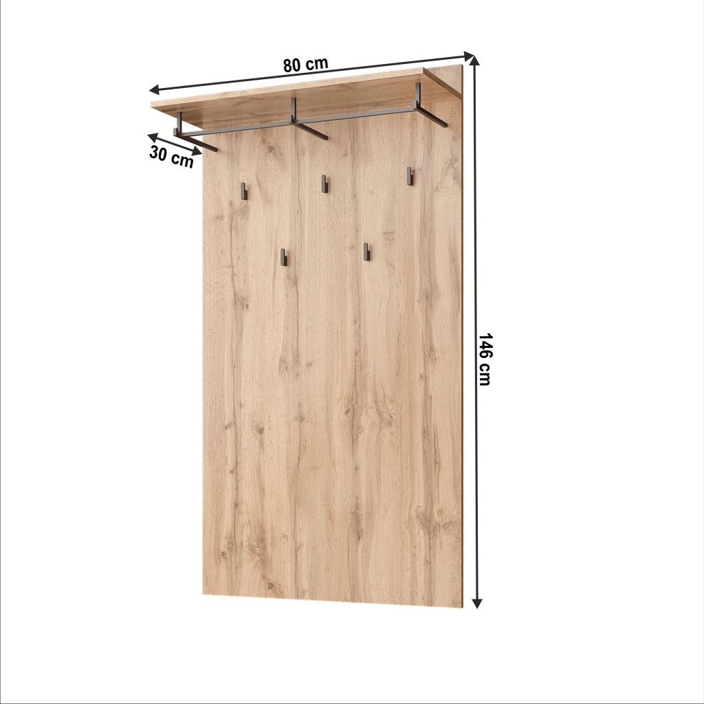 Vešiaková stena z laminovanej DTD a kovu v dekore dub wotan ponúka praktický úložný priestor. Rozmery 80x30x146 cm, päť vešiakov a polica. Dodávaná v demonte.