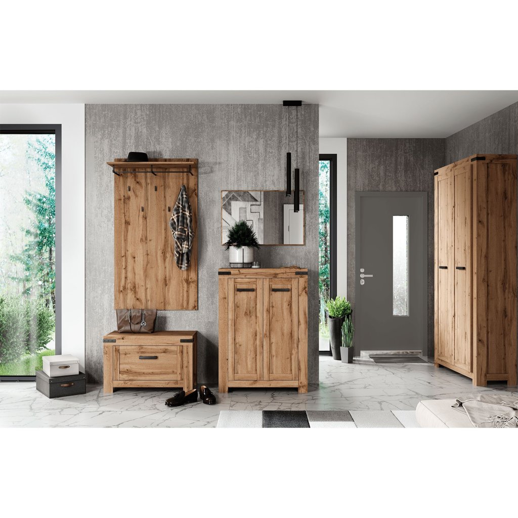 Vešiaková stena MORATIZ v elegantnej farbe dub wotan je ideálnym riešením pre moderné interiéry. Tento funkčný kus nábytku poskytuje dostatok miesta na zavesenie kabátov a ďalších odevov, pričom jeho dizajn sa hodí do každého vstupného priestoru.