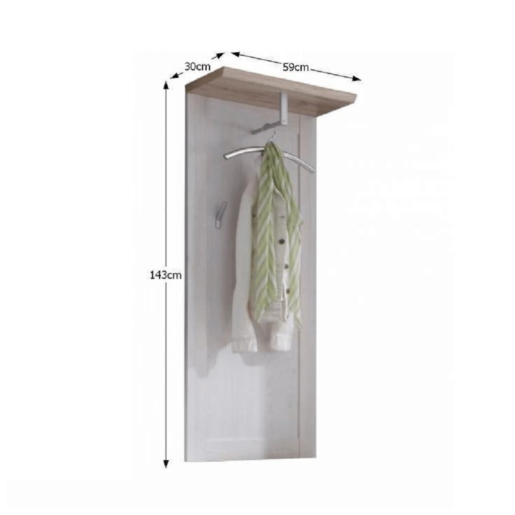 Vešiaková stena PROVENSAL v bielej farbe so spodným a vrchným plátom v odtieni dub San Remo. Rozmery: 59x30x143 cm. Dodávané v demonte, ideálne pre moderné predsiene.